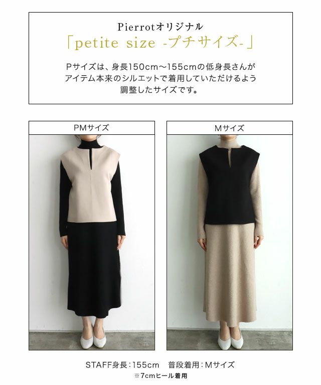 151cmでPMサイズ、ライトベージュ×ブラック購入。長さはふくらはぎ真ん中より少し下です。柔らかく肌触りがいいニットで、敏感肌の私でも首周りもチクチクしません。伸縮性があって、着心地もいいです。ベストはツルツルした肌触りで、羽織るだけでオシャレ度がアップします。別々に使えるので、着回しが効きそうです。