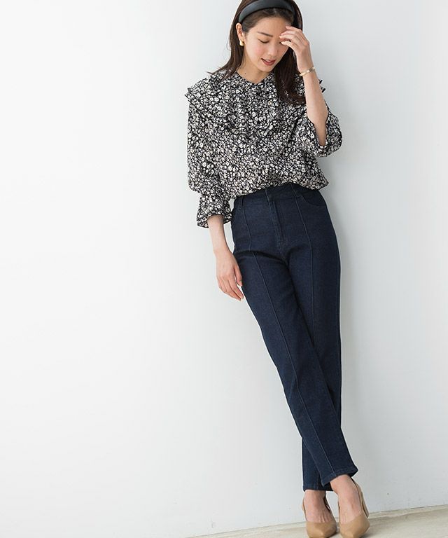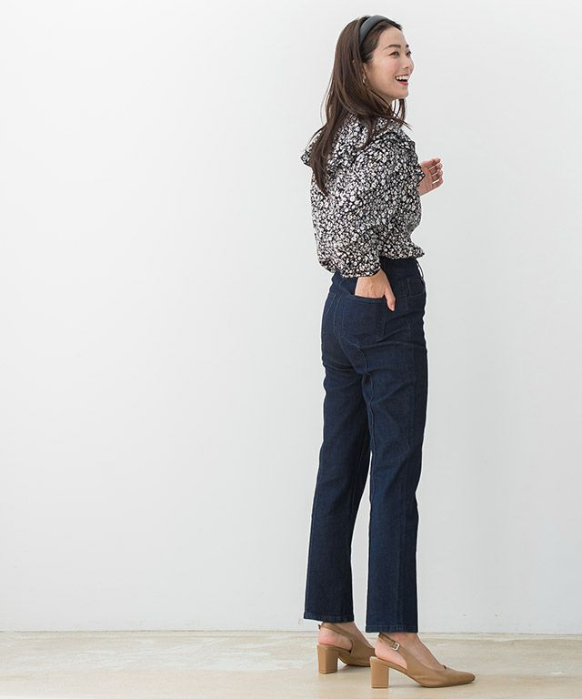程よいストレッチ性とハリ感のあるデニム素材で、高見えしながらストレスフリーな着心地を叶えます。