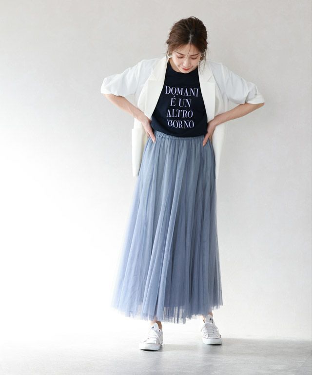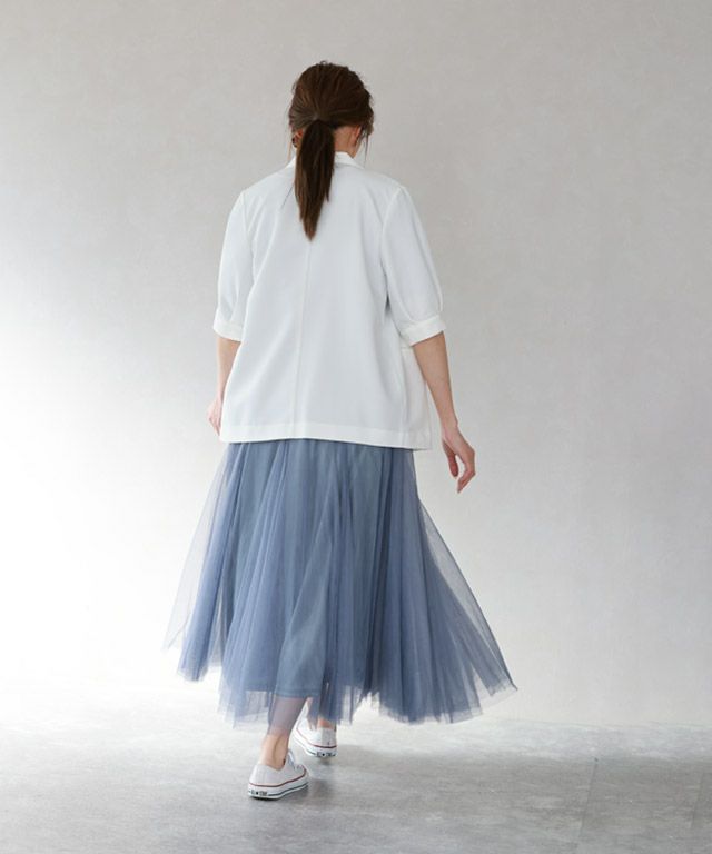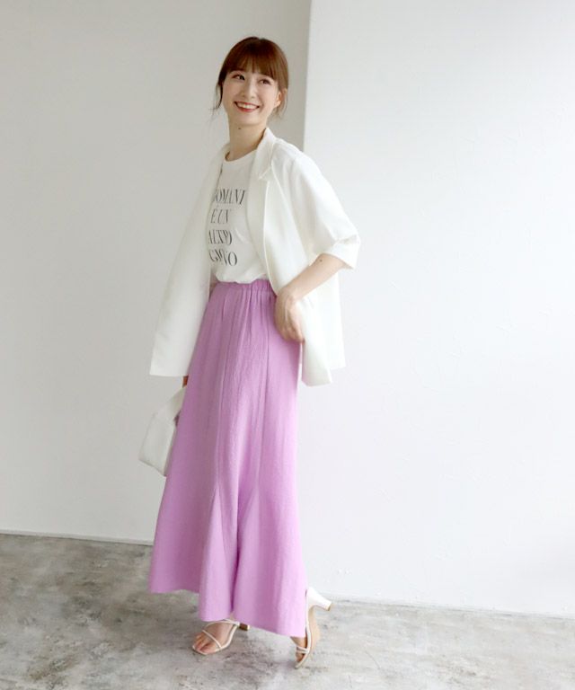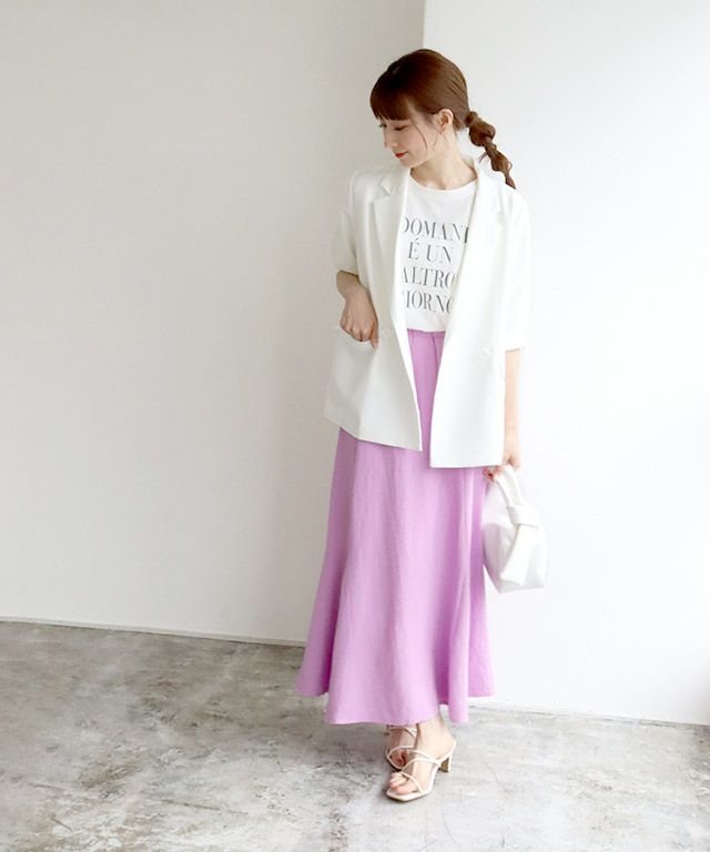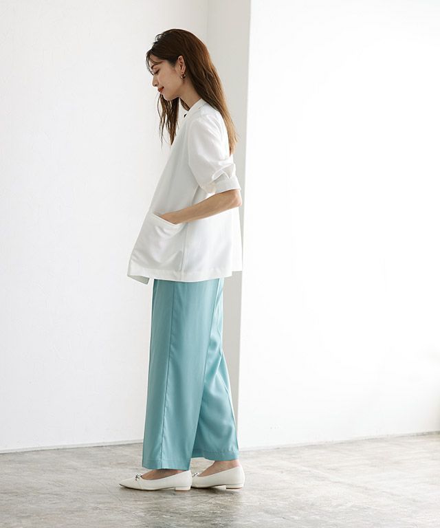 落ち感があり滑らかな肌触りのレーヨン混素材。程よく厚みがあり大人っぽいシルエットへと導きます。