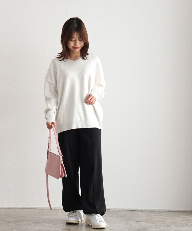 J 着丈は足首が見える丈感でした。ウエストは程よくゆとりがあり、ヒップにはゆとりがあります。柔らかく軽い着心地です。ゆとりのあるシルエットなので窮屈感なく着用できます。