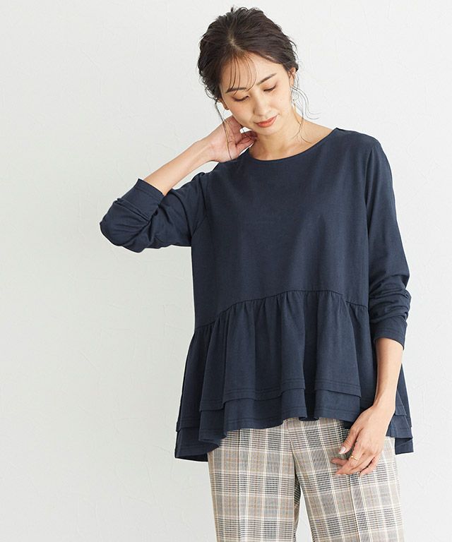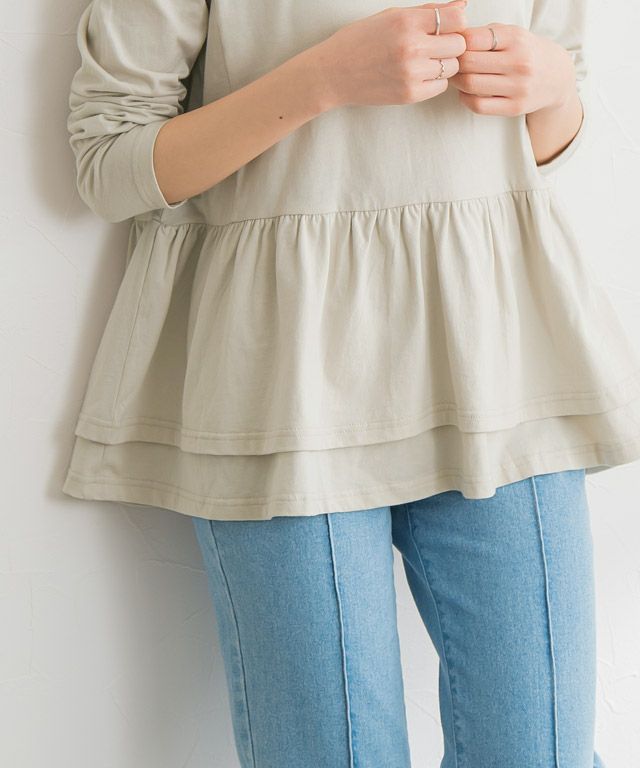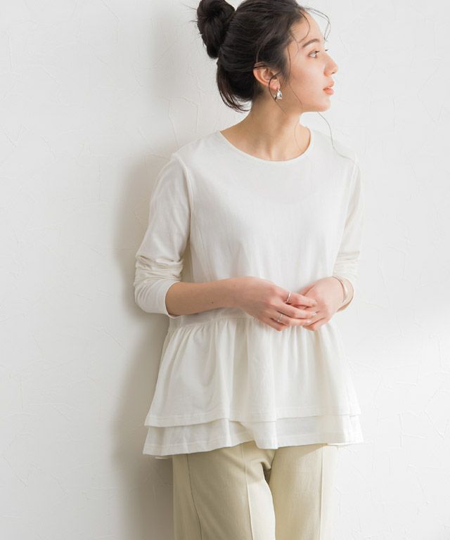 ウエストから広がるフリルデザインがフェミニンな印象の一枚。腰回りの体型カバーにもなる優秀デザインです。シンプルにパンツやスカートと合わせてもサマ見えするアイテムです。
