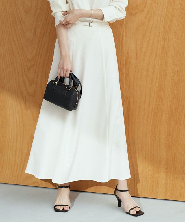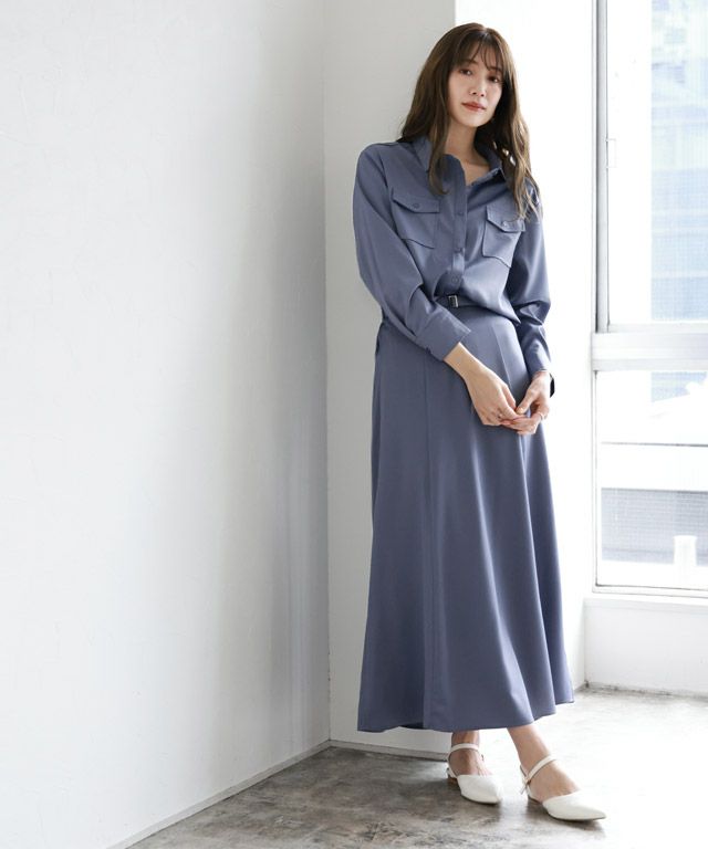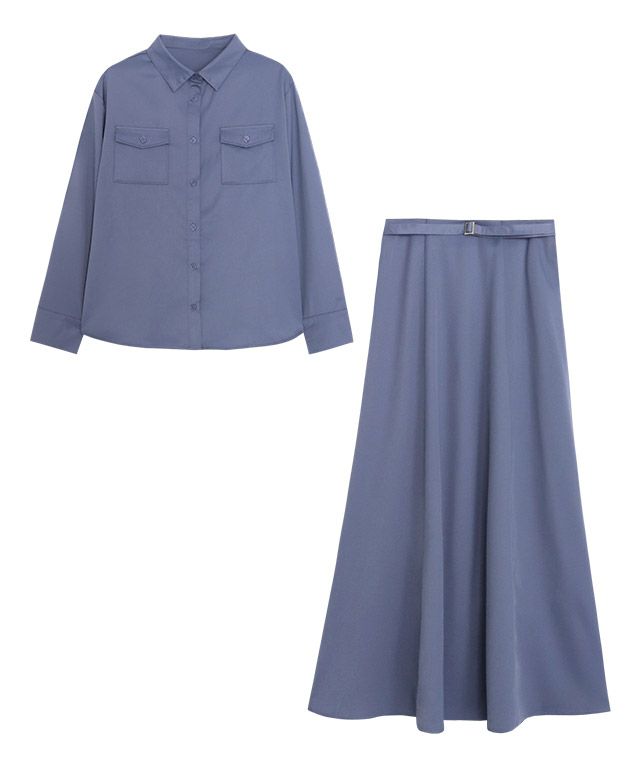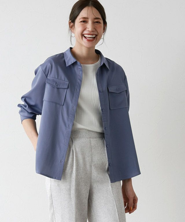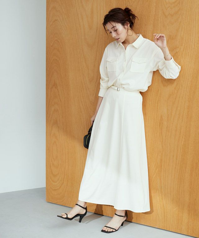 フラップポケットやシャツ襟がメンズライクなデザインながらも、とろみ素材で女性らしさ溢れるアイテム。スカートは広がりすぎないシルエットと細ベルトが華奢な印象に◎単品使いでも着回しやすいデザインです。
