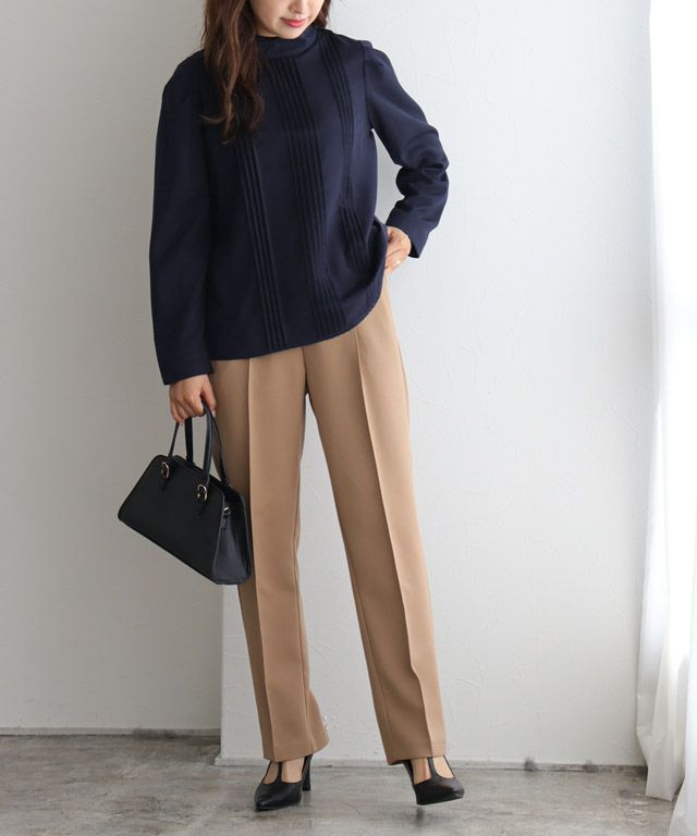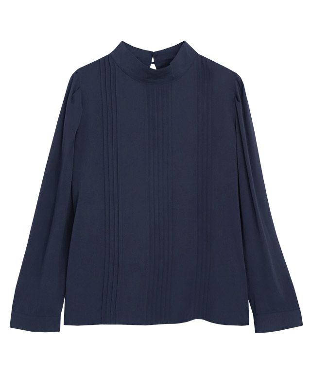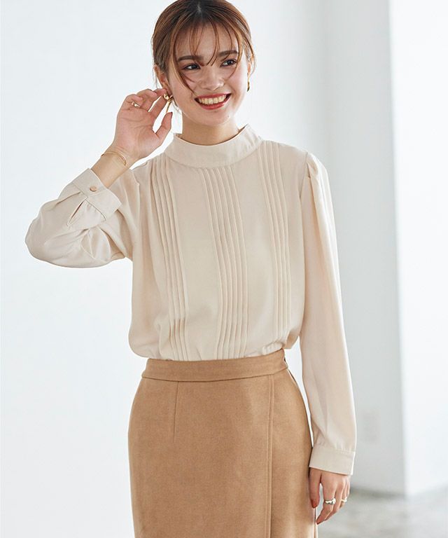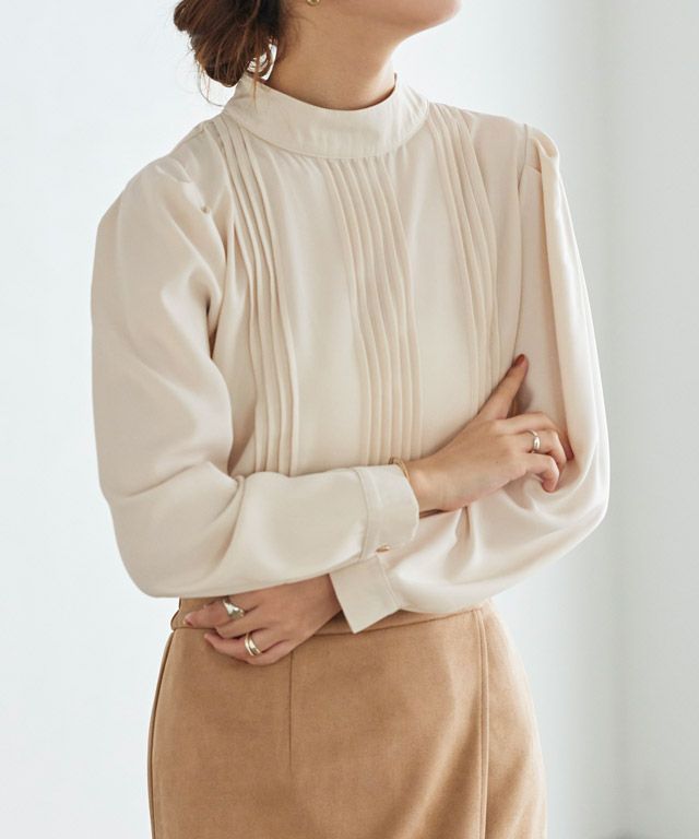 上品なスタイルを完成する“ピンタックハイネックブラウス”