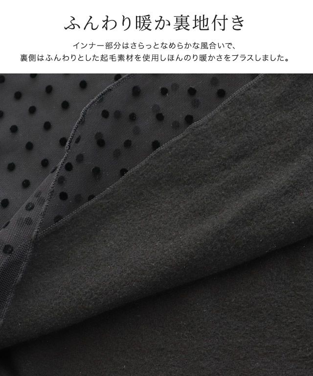 インナー部分はさらっとなめらかな風合いで、裏側はふんわりとした起毛素材を使用しほんのり暖かさをプラスしました。チュールはドット、レース、ラメのトレンド柄からお選びいただけます。