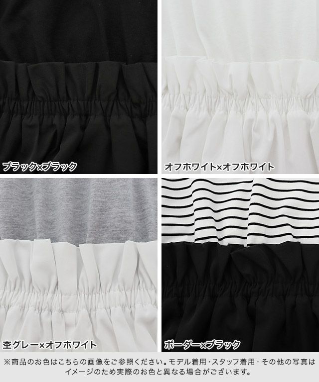 異素材がドッキングされたデザインで、トップスをインしているかのように見える優秀デザインのワンピース。ウエストにフリルを施し、ウエストからふんわり広がるフレアシルエットが女性らしさを漂わせます。カーディガンなども羽織りやすいフレンチスリーブで、肩回りも隠れて体型カバーにも◎小物次第できれいめからカジュアルスタイルまで着回せる一枚です。