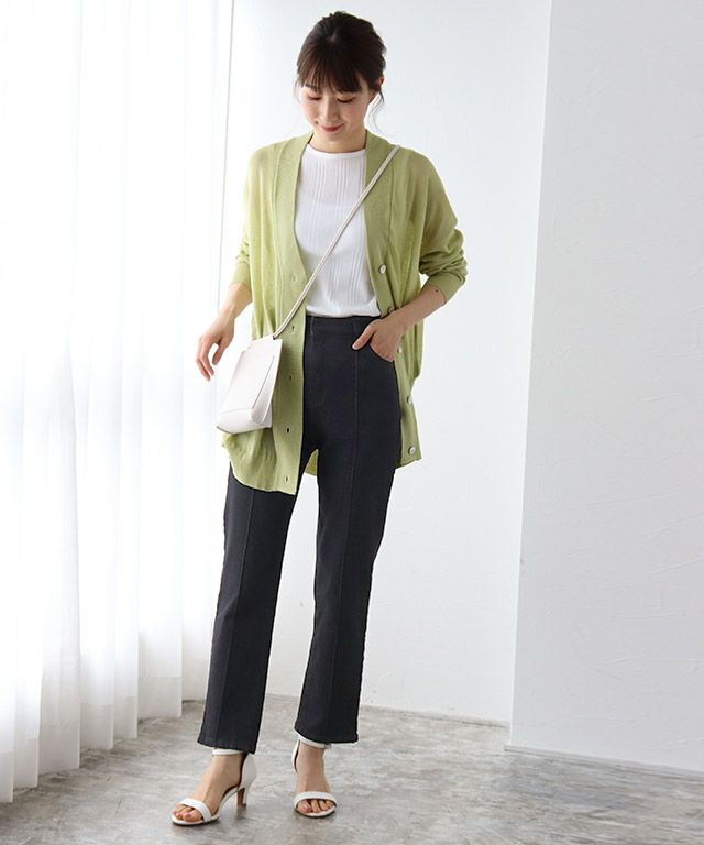 I 着丈は足首ちょうどの丈感で、フラットシューズを履いても問題なく着用できます。ウエストやヒップ周りはちょうど良いフィット感ですっきりと見えます。