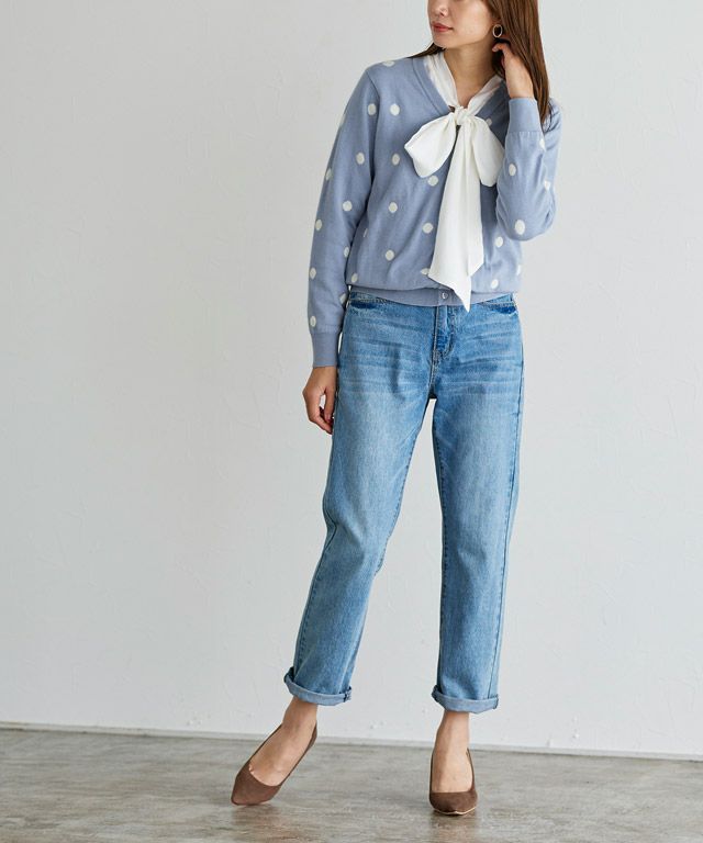 幅広い体型の方に馴染みやすいようドットの大きさにこだわり、ジャガード織で編み立てました。長めの袖口リブがポワン袖と相まって華奢見えします。肩からボリュームのあるスリーブデザインにすることで旬なイメージをプラスしました。