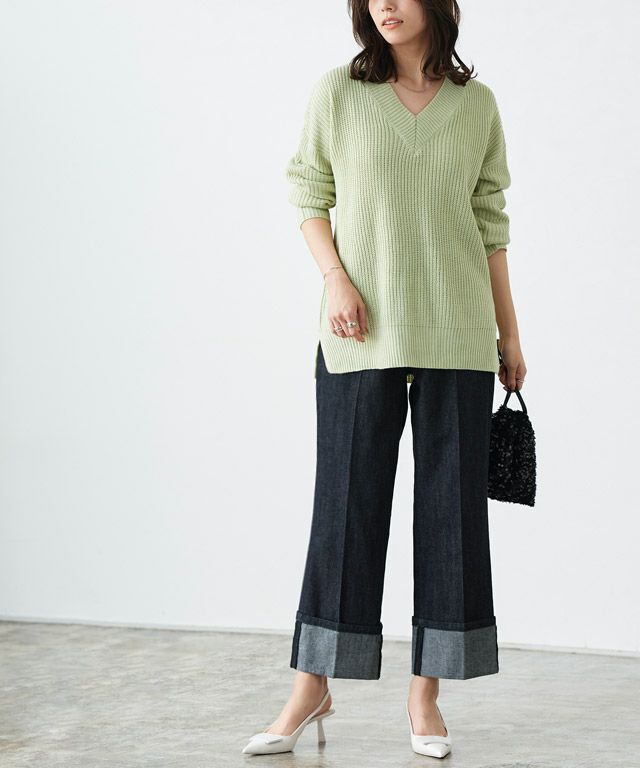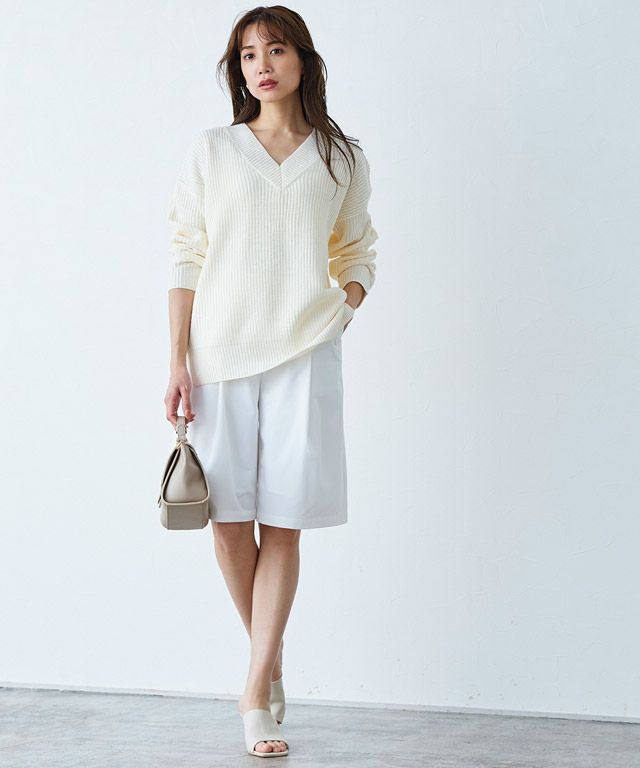ゆったりとしたサイジングと、やや太めの袖がルーズな雰囲気漂うニット。ゆとりのあるサイジングなので、首元はVネックで抜け感をプラスしました。ボトムを選ばず合わせやすく、レイヤードスタイルや肩にかけるなど様々なテイストで着回せる一枚です。