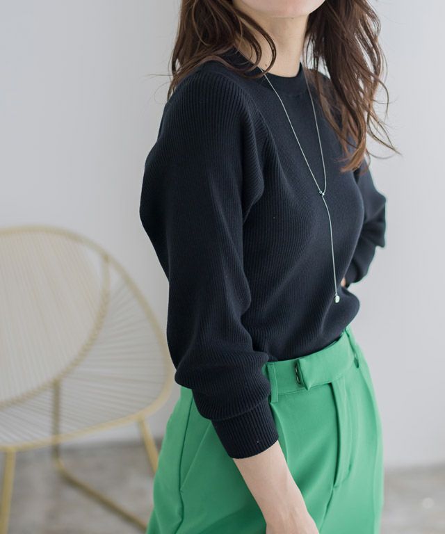 肩から袖にかけて丸みのあるパワーショルダーデザインで、シンプルながらもトレンド感をプラス。ボトムスを選ばず合わせやすく、アウターなどのインナーとしても着用しやすい一枚です。