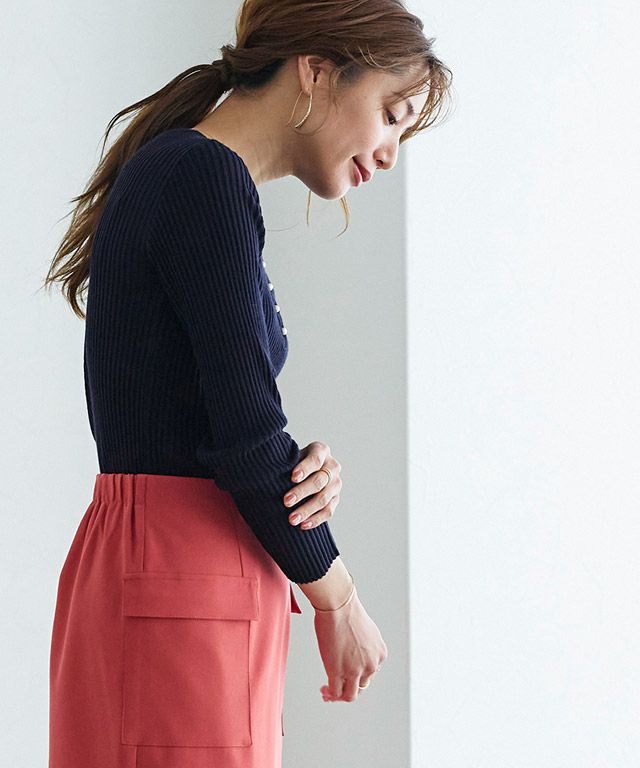 レーヨン混の柔らかさとポリエステルの程良いハリ感でさらりとした肌触りが魅力的。リブ編みにすることでスタイリングに表情をプラスしてくれます。