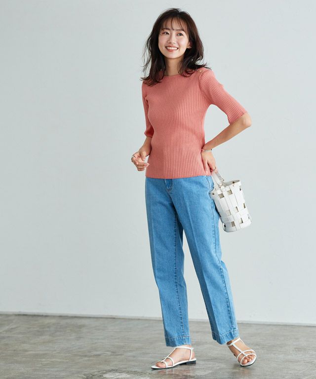 さらっとした風合いで清涼感があり、夏でも着心地の良いニット素材。少し光沢感があるのでカジュアルになりすぎず上品な印象に。表情がありすっきり見えするリブ編みで仕上げました。