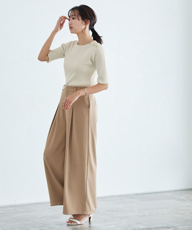 シンプルながらも肩のボタンがアクセントになったニット。ゴールドボタンで上品さがあり、トレンドのマリンスタイルにぴったりな一枚。二の腕まで隠れる五分袖も嬉しいポイントです。ボトムスを選ばず合わせやすいデザイントップスです。