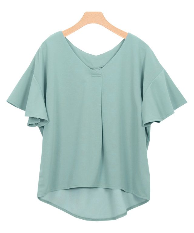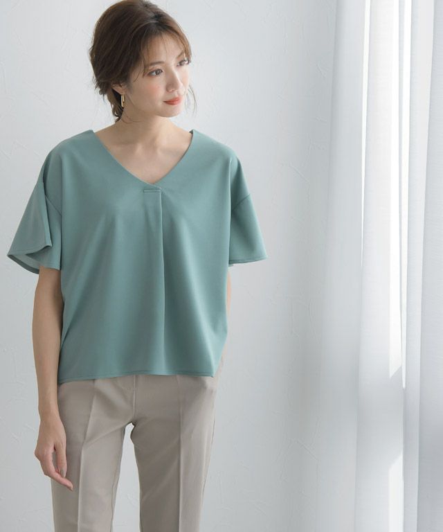 前後Vネック仕様にすることでナチュラルな抜け感をプラス。フレアスリーブデザインは腕周りを華奢に見せてくれ、フロント部分にタックを施すことで、自然なゆとりがうまれふんわりとしたシルエットに。