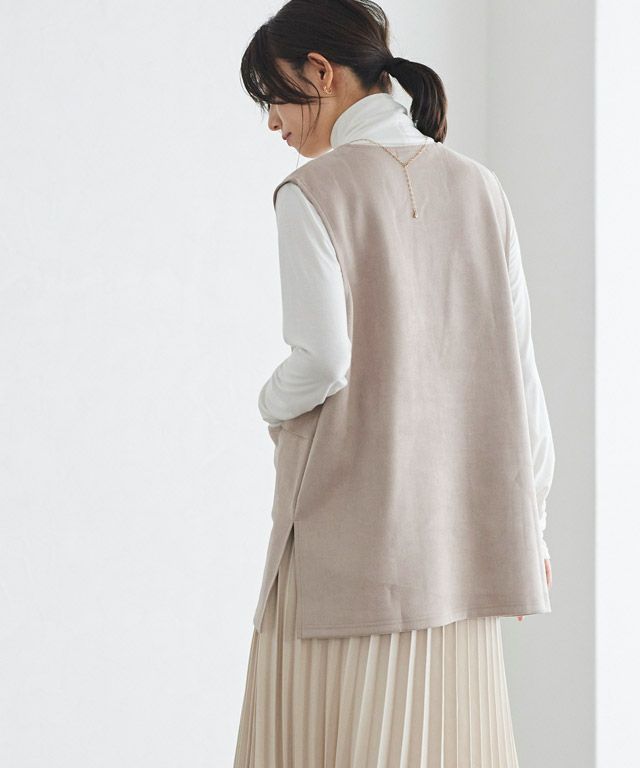 ベストは、表面の起毛感が温かみを添えられるフェイクスエード素材。厚みがあり透ける心配が無く、伸縮性に優れているのも魅力ポイント。インナーは、柔らかく滑らかな肌触りで程よくとろみ感のある風合いに。身頃はコンパクトめなシルエットなので、伸縮性のある素材にしました。