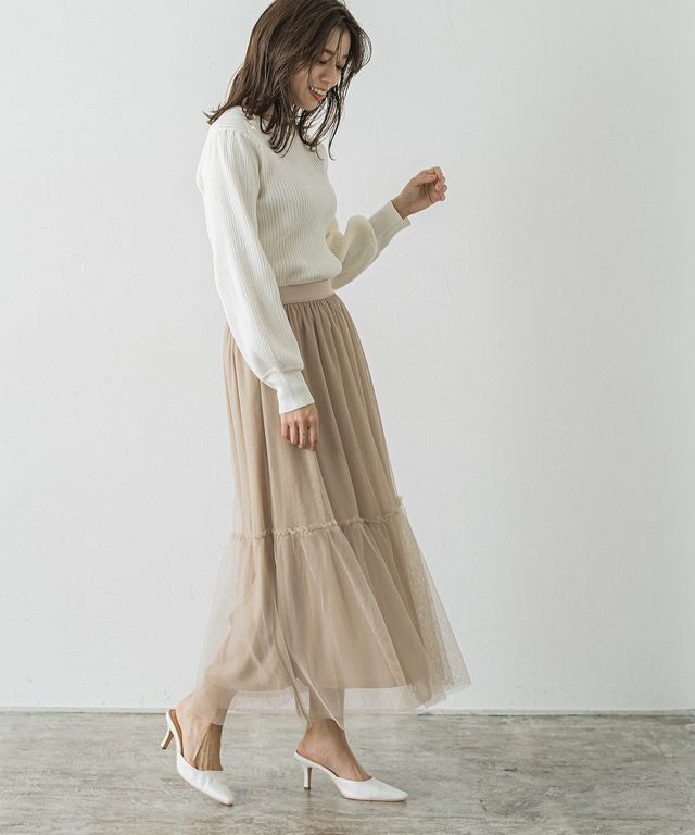 肩にパールボタンを施し顔周りを華やかに仕上げた着映えニット。ふんわりボリューム感のある袖デザインが、女性らしい印象に導きます。インでもアウトでも使える程良くゆとりのあるサイズ感が嬉しい◎