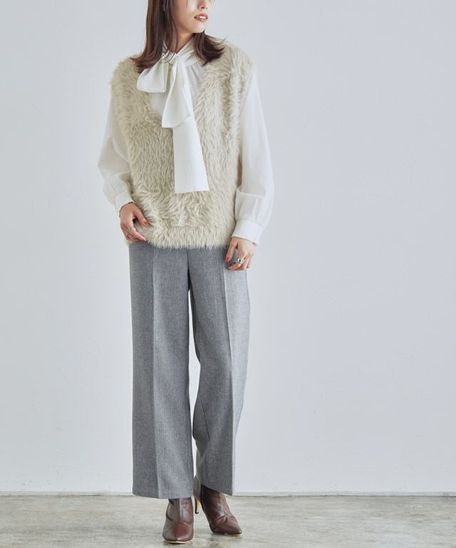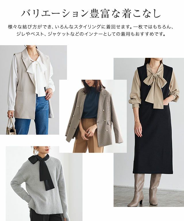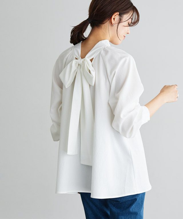 ハイネックとリボンの前後2wayで着用できるデザインブラウス。大きめのリボンがアクセントになりフェミニンな印象に。様々な結び方ができ、いろんなスタイリングに着回せます。ふんわり広がるAラインシルエットが女性らしく、腰周りの体型カバーにも◎インスタイルもしやすいフレア感に仕上げました。一枚での着用はもちろん、ジレやベスト、ジャケットなどのインナーとしての着用もおすすめです。