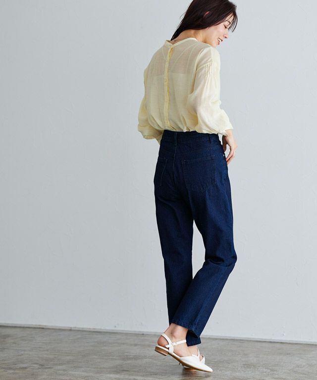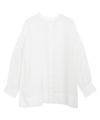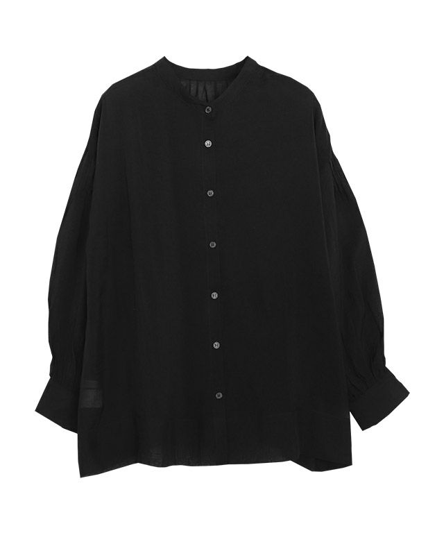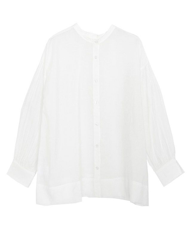前後着用可能な2WAY仕様で、異なるデザインを楽しめる一枚。ブラウスとしてはもちろん、前を開けて軽い羽織りとしても活躍します。落ち感のあるボリュームスリーブが上品な印象をプラスしてくれます。
