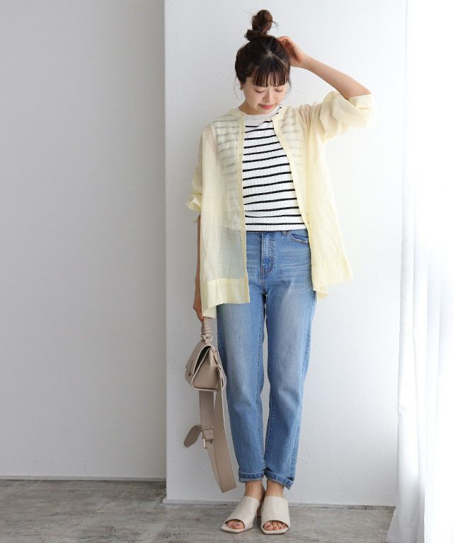 N 着丈はお尻が3分の2隠れる丈感でした。袖丈は手の甲に少しかかります。身幅はゆとりがありました。シアー感がある素材なので、真夏の羽織としても使えそうです。