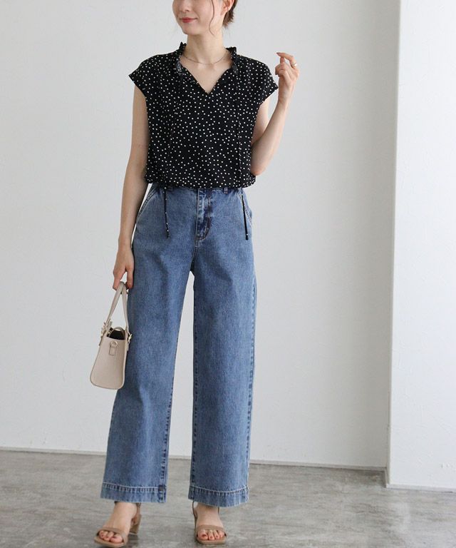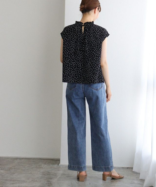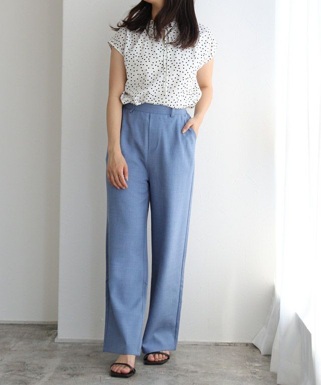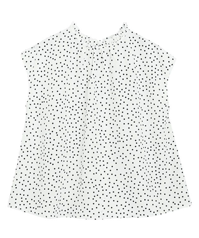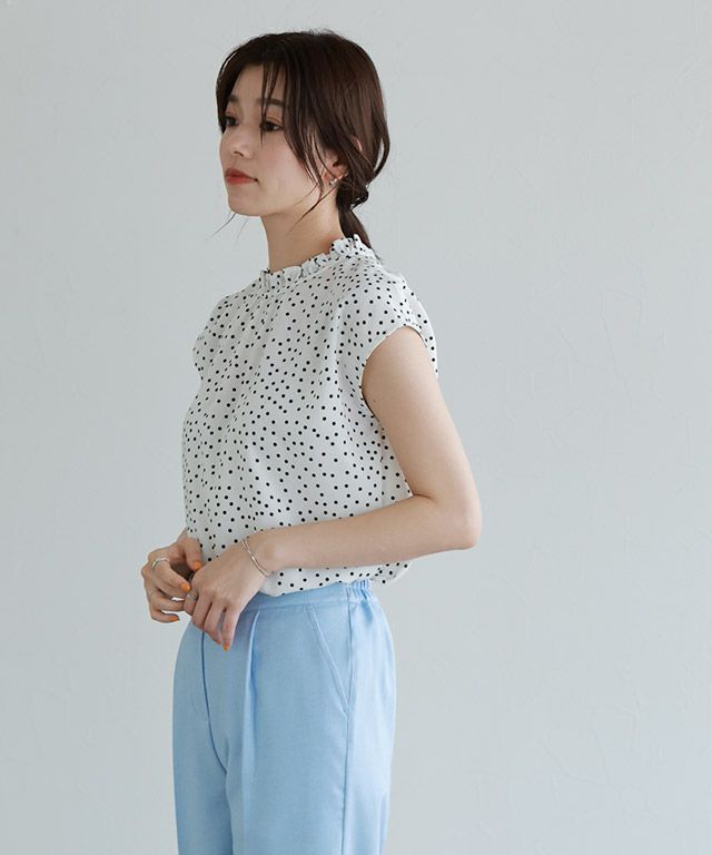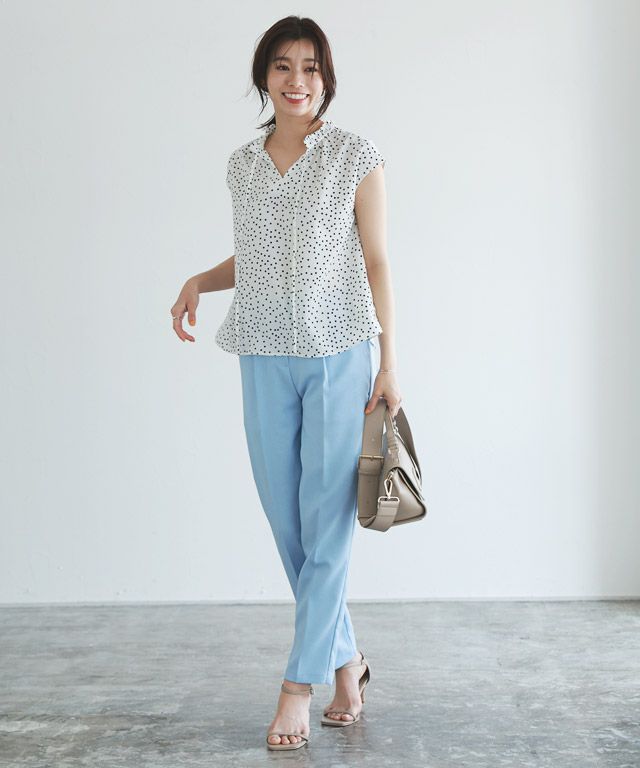 カジュアルすぎず合わせやすい小さめドットが、女性らしい雰囲気に。清涼感溢れる薄手の生地が軽やかな印象です。