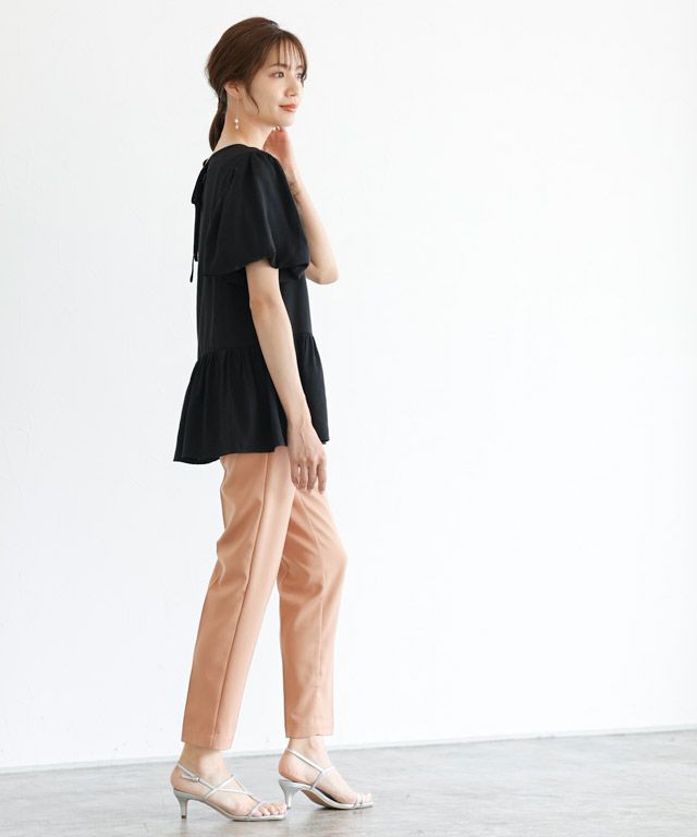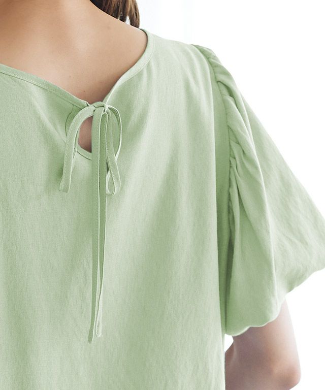 C 着丈はお尻がほとんど隠れる丈感でした。袖丈は二の腕が隠れます。袖口のゴムは程よいフィット感があり、自然とボリュームが出ます◎身幅はゆとりがありました。バックリボンは紐で結べるのでネック周りの広さを少し調整できます。薄手で柔らかくさらっとした生地でした。
