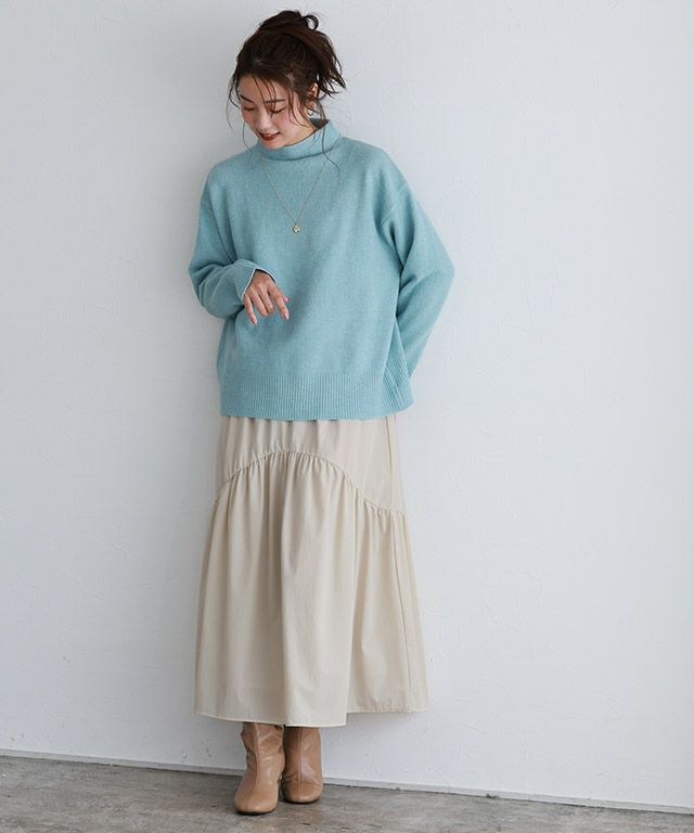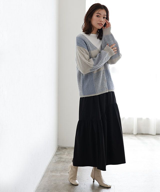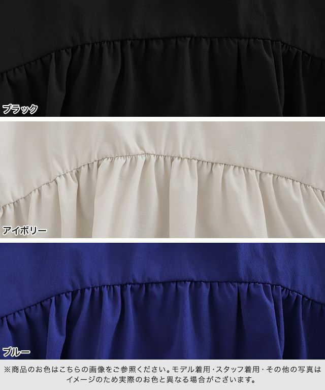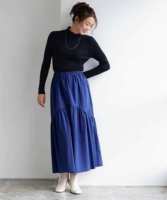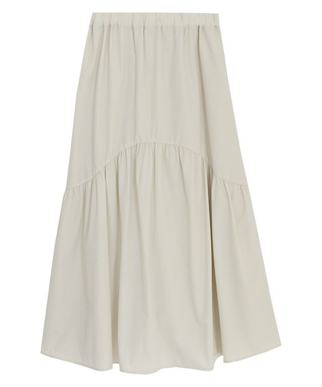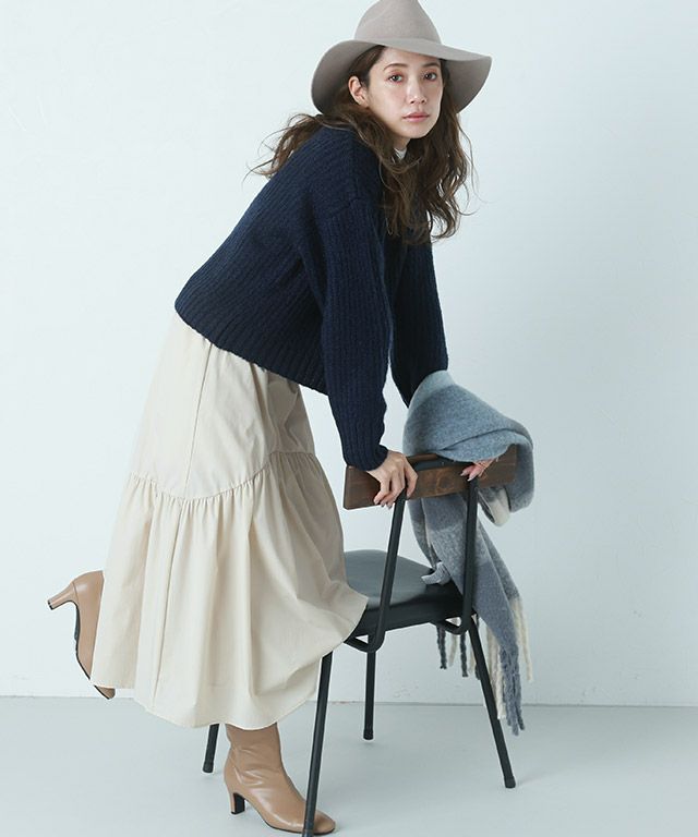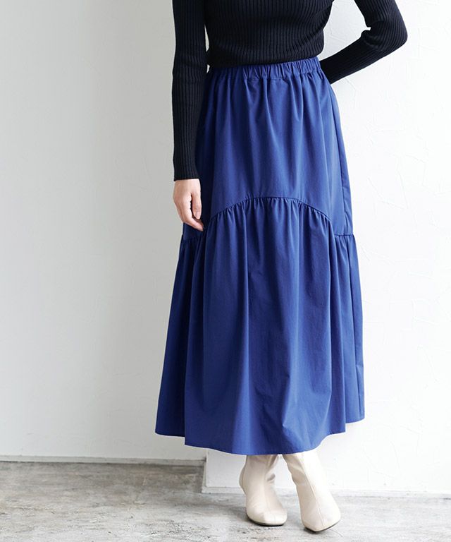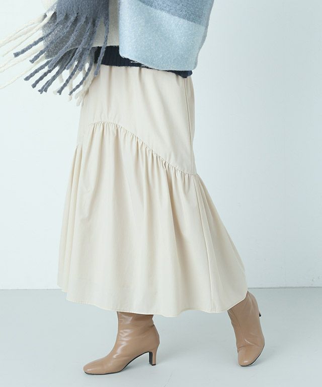 ボリューム感が可愛いギャザー切り替えのスカート。たっぷりギャザーを施したティアードシルエットが、女性らしさを高めるデザインです。アーチ状の切り替えで存在感があり、シンプルなニットに合わせるだけでも旬な装いに◎