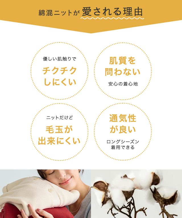 通気性の良い綿混素材を使用し、やわらかな肌ざわりと快適な着心地を実現。静電気防止機能に加え、ご自宅で洗えるウォッシャブル仕様&毛玉ができにくいピリング防止加工で、毎日のおしゃれに気兼ねなく取り入れられるのも嬉しいポイントです。