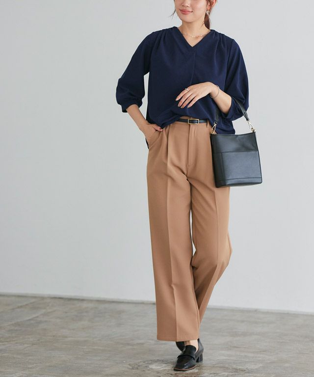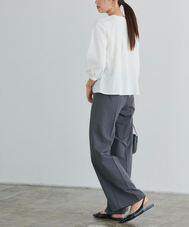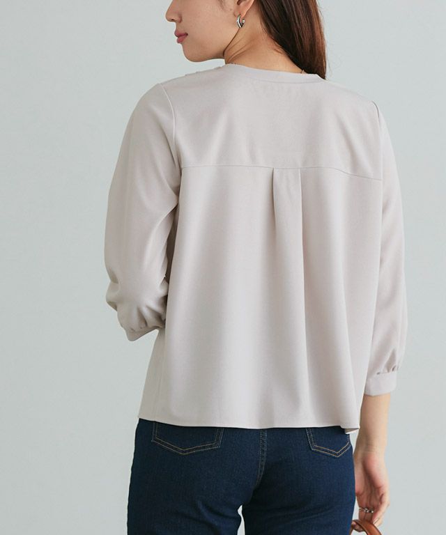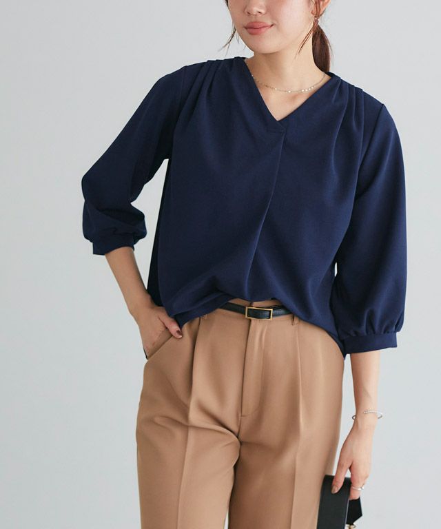 首元をすっきりと見せてくれるVネック。肩部分に施したタックで のっぺりせず、大人な雰囲気に◎ボリュームのある袖でフェミニンさを プラスしつつ七分袖で抜け感を演出した一枚に仕上げました。