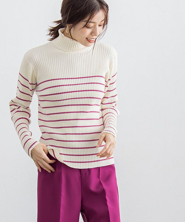 ワードローブに欠かせない“選べるタートルネックリブニット” レーヨン混なので柔らかく、滑らかな肌触りが魅力的でずっと触っていたくなるようなリブニット。 シンプルなボーダー柄は一枚ではもちろん、レイヤードなど着回し力抜群でスタイリングの幅が広がります。パネルボーダーはスタイリングのアクセントになり、一枚でこなれ感を演出します。 【ブランド】 marvelous by Pierrot(マーベラスバイピエロ)