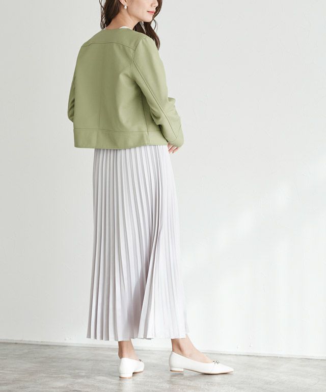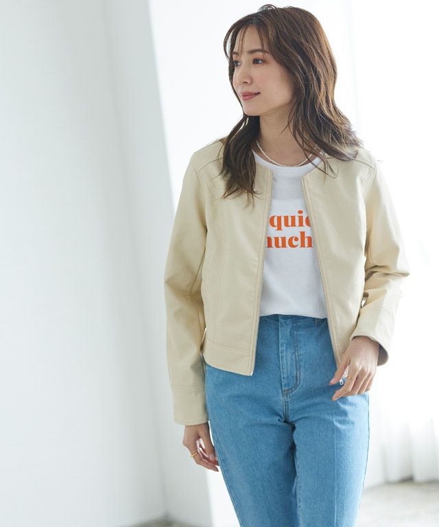 大人な印象に仕上げる“フェイクレザーノーカラージャケット”