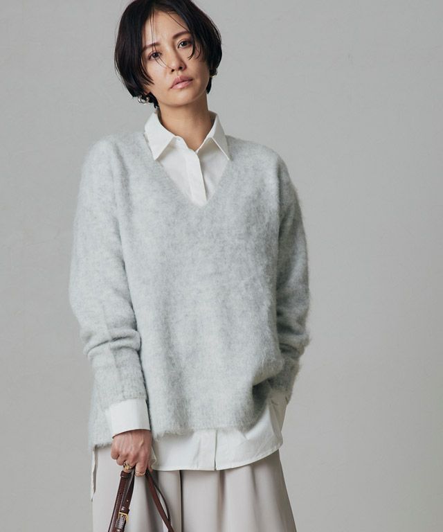 トレンド感と表情をプラスしてくれる毛足の長いシャギー素材。ニュアンスカラーとふんわりとした表面感が相まって女性らしい柔らかな雰囲気へと導いてくれます。アルパカ混紡で軽くて暖かい、着心地の良い一枚です。