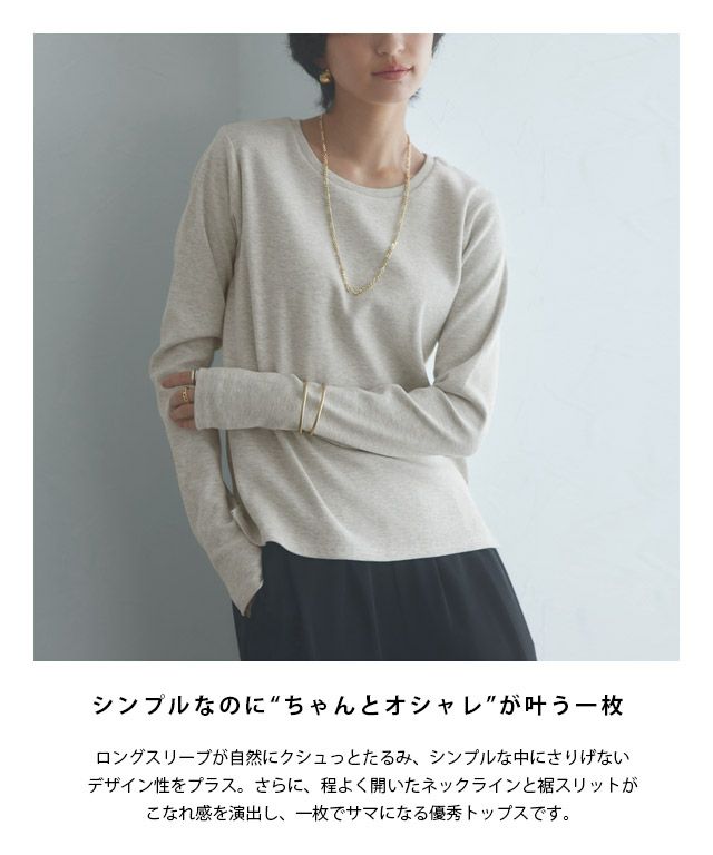 ロングスリーブで自然とクシュっとなり、シンプルなシルエットの中にニュアンス感をプラスします。ベーシックなシルエットとUネックデザインが、どんなスタイリングにも合わせやすく着回しの効く一枚です。