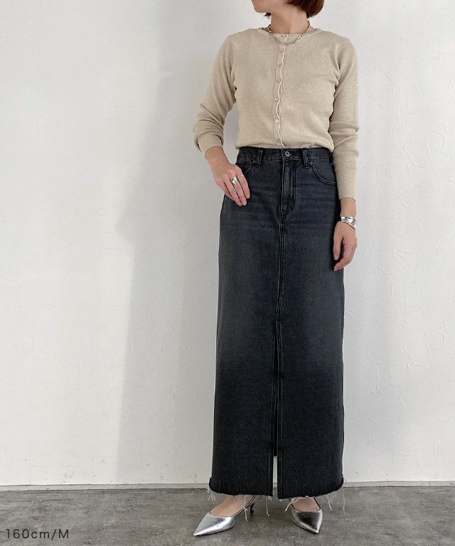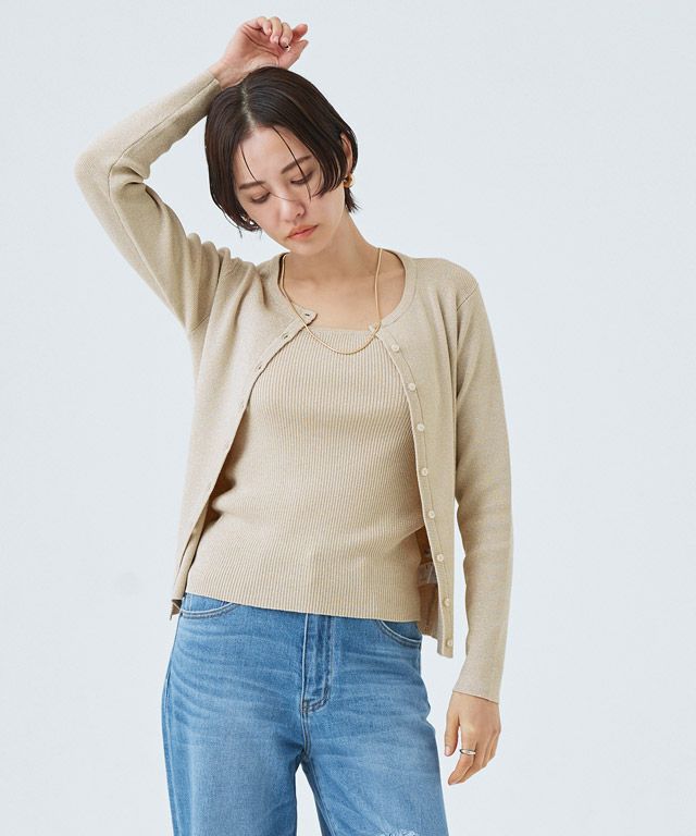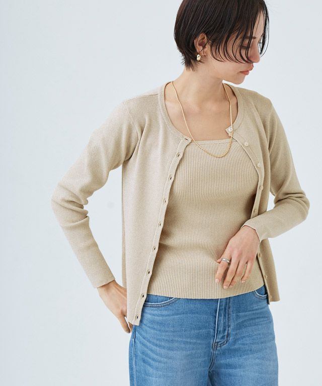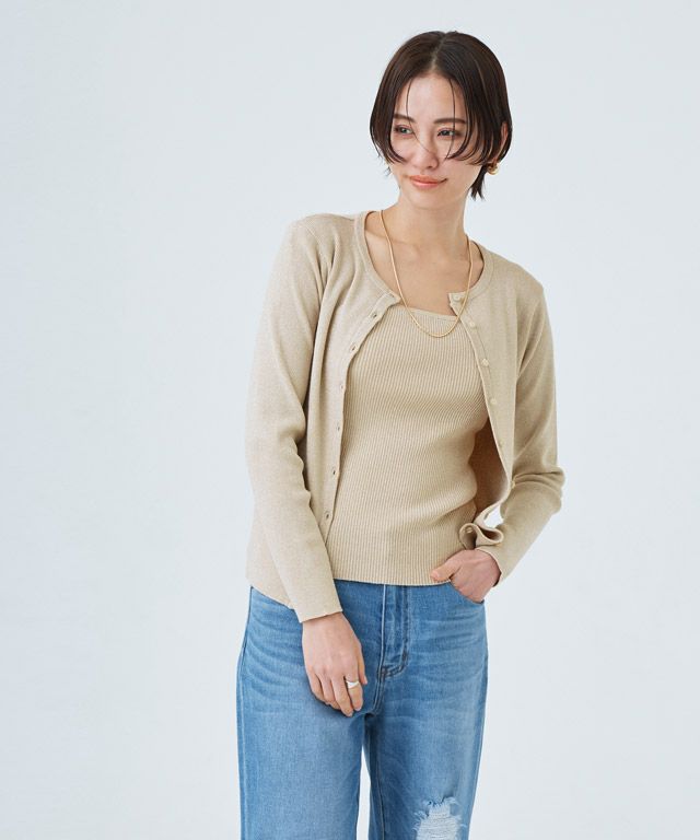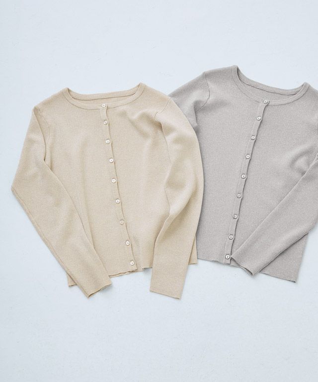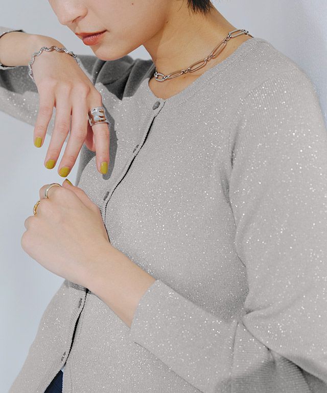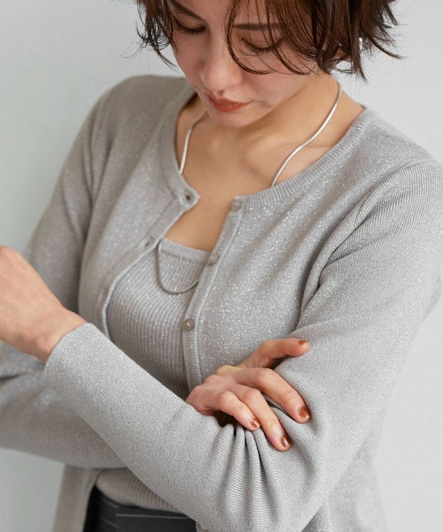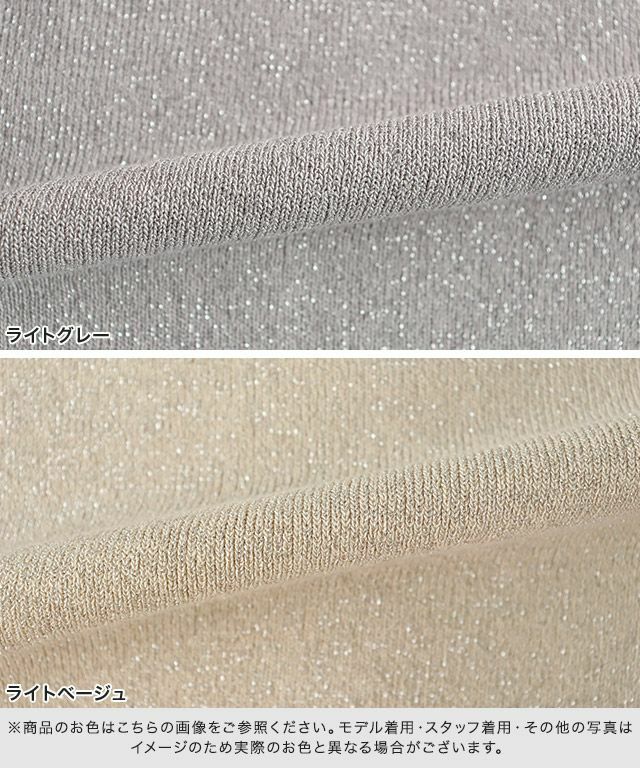 キラキラとしたラメ糸が特徴的なニット素材。程よいラメ感と細リブ編みで上品な印象へと仕上げました。柔らかな肌触りで素肌に当たってもチクチクしないところも魅力のひとつ。