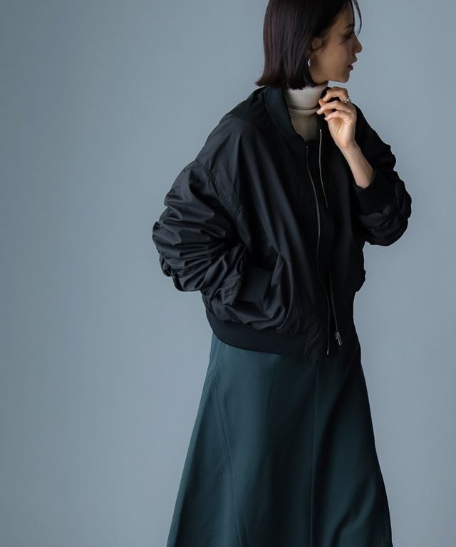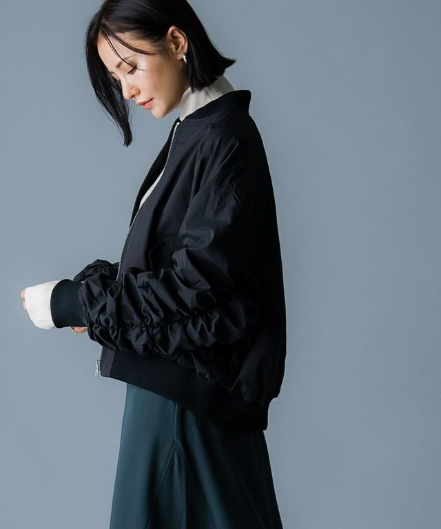 袖にたっぷりのギャザーを施したボリュームスリーブがポイントなMA-1ブルゾン。トレンドライクなコンパクト丈はどんなコーデとも合わせやすく、バランス良く着こなせます。自然と後ろに抜ける丸みのあるシルエットで羽織るだけでこなれ感のあるスタイルが完成するアイテムです。