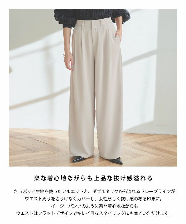 たっぷりと生地を使ったシルエットと、ダブルタックから流れるドレープラインがウエスト周りをさりげなくカバーし、女性らしく抜け感のある印象に。イージーパンツのように楽な着心地ながらもウエストはフラットデザインでキレイ目なスタイリングにも着ていただけます。