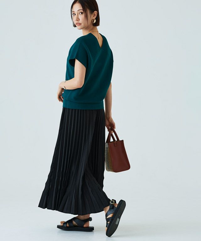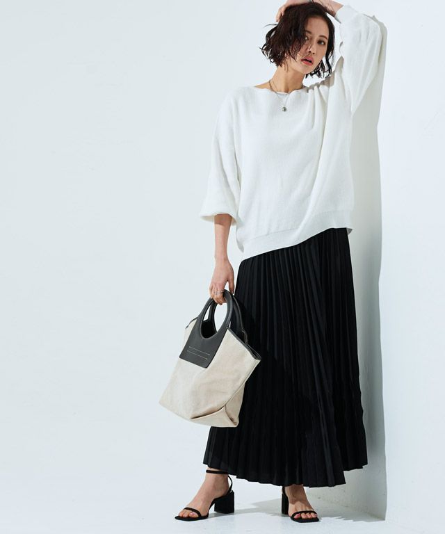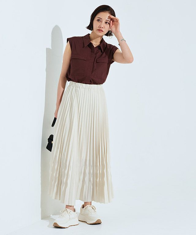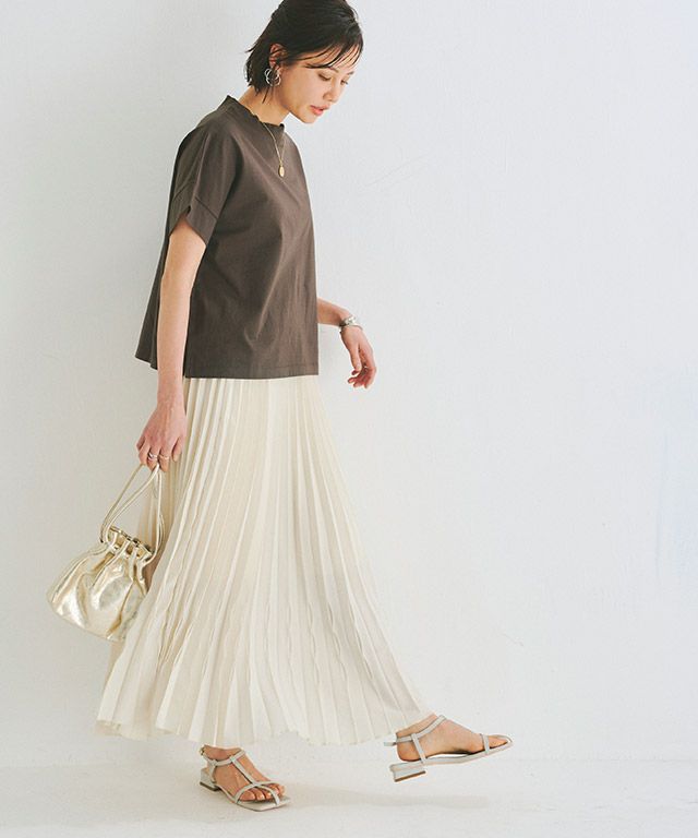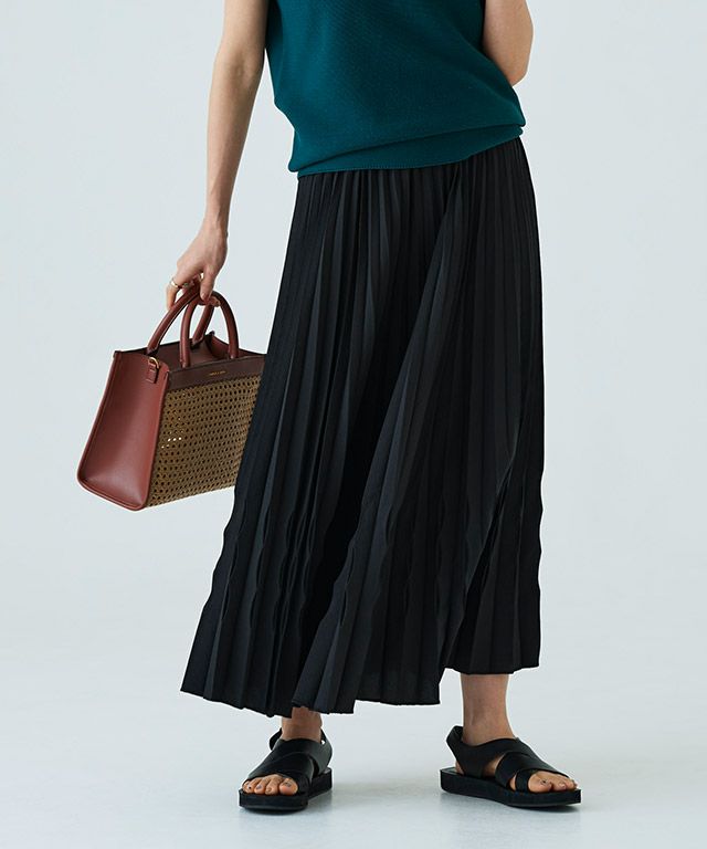 細かなプリーツデザインの中に、裾に施された凹凸のあるシルエットが目を惹く一枚。コーディネートに上品な華やかさをプラスしてくれるので、シンプルなトップスを合わせるだけでサマになる主役級スカートです。