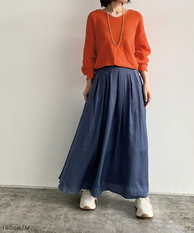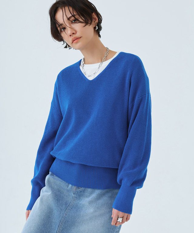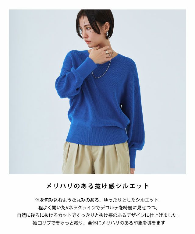 体を包み込むような丸みのある、ゆったりとしたシルエット。程よく開いたVネックラインでデコルテを綺麗に見せつつ、自然に後ろに抜けるカットですっきりと抜け感のあるデザインに仕上げました。袖口リブできゅっと絞り、全体にメリハリのある印象を導きます。