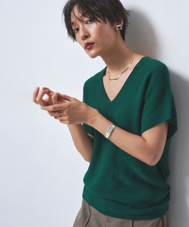 裾に向かってすぼまったデザインは、自然に立体感のあるニュアンスシルエットを作り出し、こなれた印象へと導きます。包み込むようなシルエットとフレンチスリーブが体のラインをさりげなくカバーしてくれるところも魅力の一つです。前後深めに入ったVネックは顔周りをすっきりと見せ、抜け感のある雰囲気に。