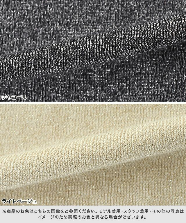 綿糸とラメ糸の2種類を一緒に編み上げたニット素材。綿特有の柔らかくさらっとした肌触りがドライタッチな着心地を作ります。細リブで程よく厚みを出し、体のラインを拾いにくいところも魅力のひとつ。ラメ糸の華やかさが一枚で着てもサマになる素材感です。