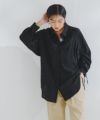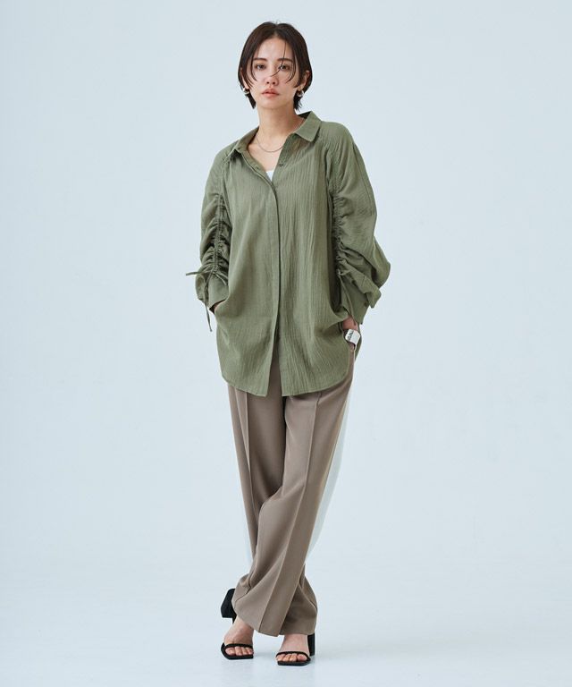 肩から袖にかけて施されたシャーリングがたっぷりのギャザーを作り出し、華やかな雰囲気溢れるアイテム。シャーリングの絞り具合で印象の変わるデザインです。シャツ襟とすっきりと見える比翼仕立てできちんとした印象に仕上げました。