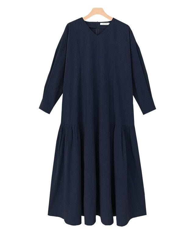 裾のギャザー切り替えが大人の女性らしいシルエットを演出するロングワンピース。袖口に向かって細くなった構築的な袖デザインがモードな印象を作り出します。すっきりとしたVネックラインで抜け感をプラス。一枚で着映える主役級ワンピースです。