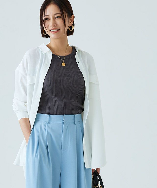 麻見えしながらお手入れの簡単なポリエステル素材を使用。凹凸のある表面と清涼感のある風合いが涼し気でこなれた印象に仕上げます。上品な落ち感が女性らしさ溢れる素材です。