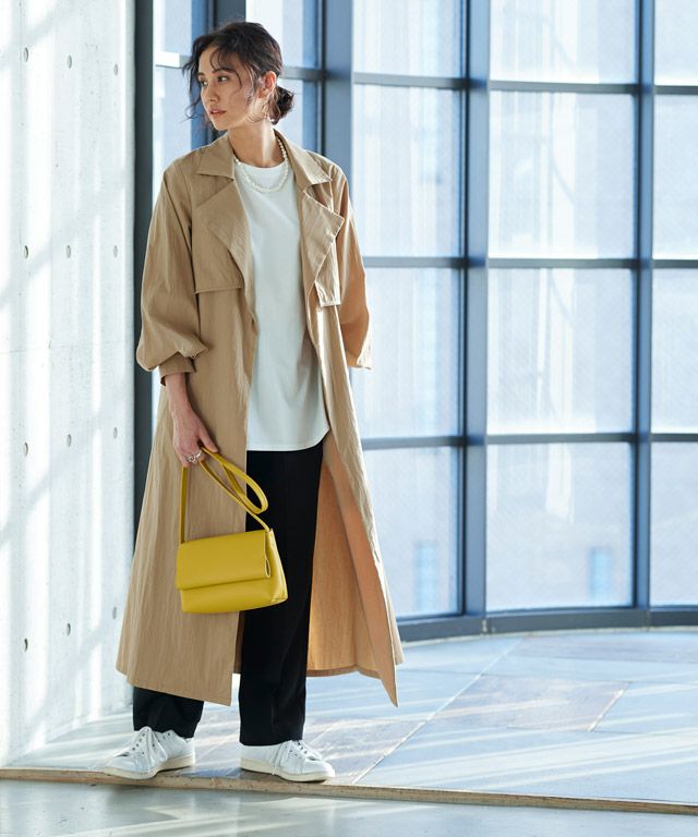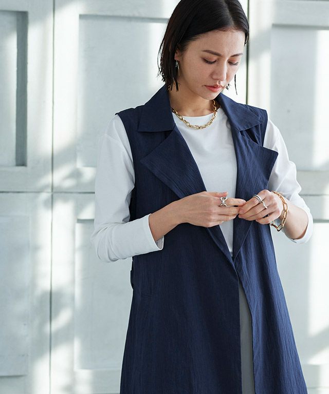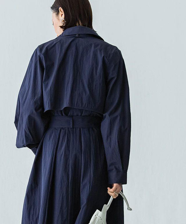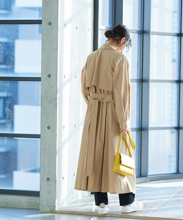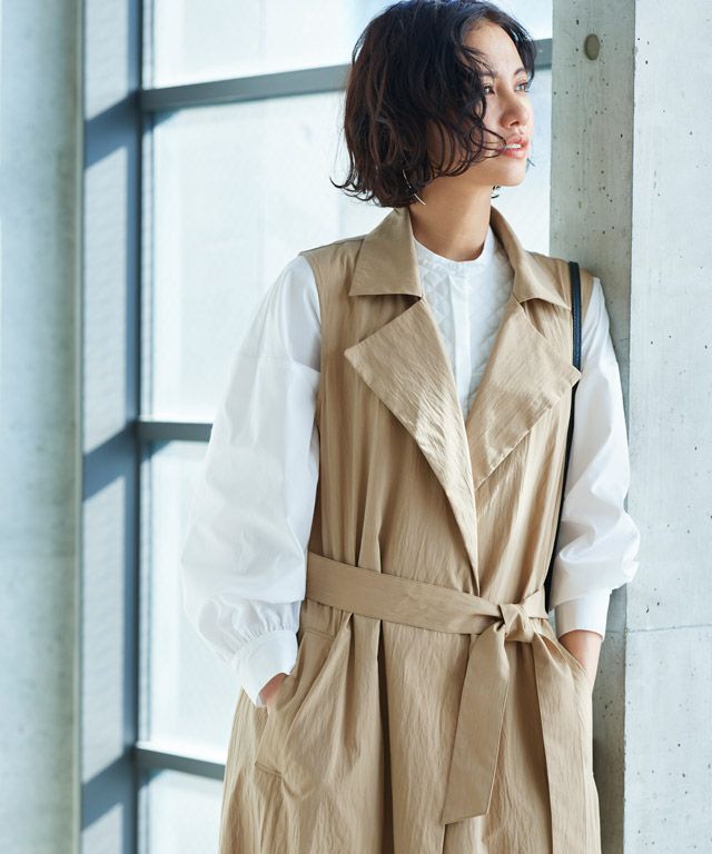 トレンチコートとしても、ジレとしても着用できる2way仕様。足元まであるロング丈と、たっぷりとボリュームを持たせたシルエットがこなれた印象に導きます。トッパータイプなのでさらっと羽織るだけでサマになる一枚です。付属のベルトでウエストマークができ、様々な着こなしができるところもポイントです。