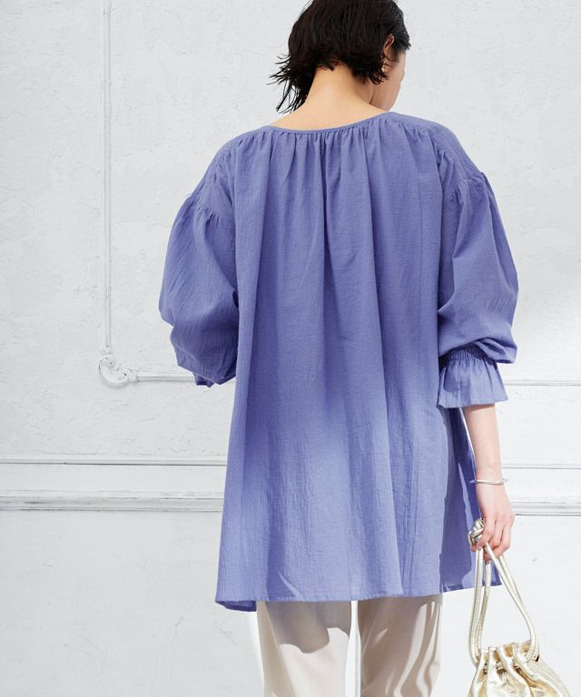 たっぷりとギャザーを寄せたボリューム感が、ふんわりと軽やかなシルエットを作り出します。すっきりと見えるVネックラインに紐をあえて垂らすことで抜け感のあるスタイリングに。裾に大胆にスリットを入れることで軽やかな動きが出ます。キャンディスリーブでこなれた雰囲気の中にも女性らしさをプラスしました。