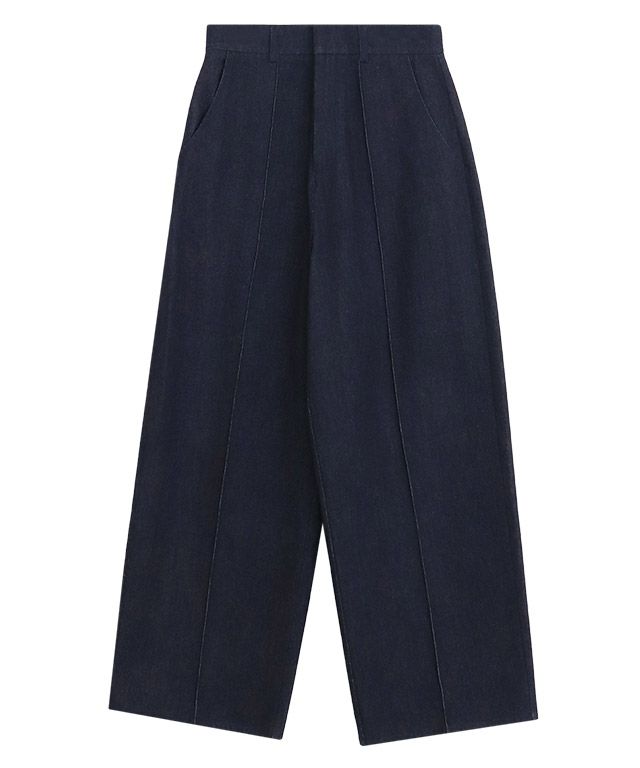 スラックスのパターンで仕立てたデニムパンツ。カジュアルな素材ながらも、上品さのあるデザインに仕上げました。センターのピンタックが足のラインをきれいに見せてくれ、きちんと感のある印象に。お洗濯で消えないところも魅力の一つです。すとんとしたストレートラインで落ち着いた大人な雰囲気へと導きます。