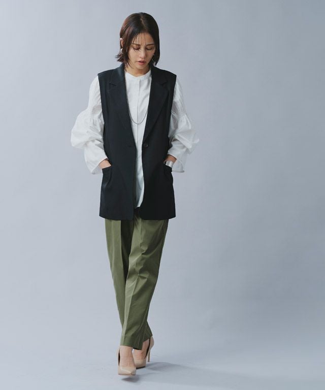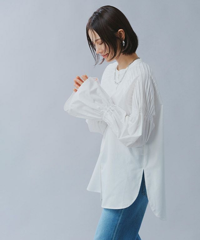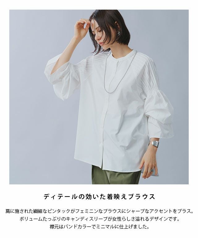 肩に施された繊細なピンタックがフェミニンなブラウスにシャープなアクセントをプラス。ボリュームたっぷりのキャンディスリーブが女性らしさ溢れるデザインです。襟元はバンドカラーでミニマルに仕上げました。