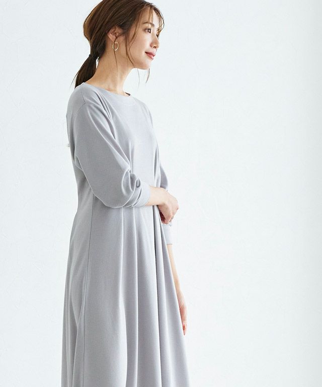 着るだけで女性らしさが惹き立つ美ラインタックワンピース。柔らかく肌触りの良い綿混のポンチカットソーを使用。年中着回しやすい素材です。