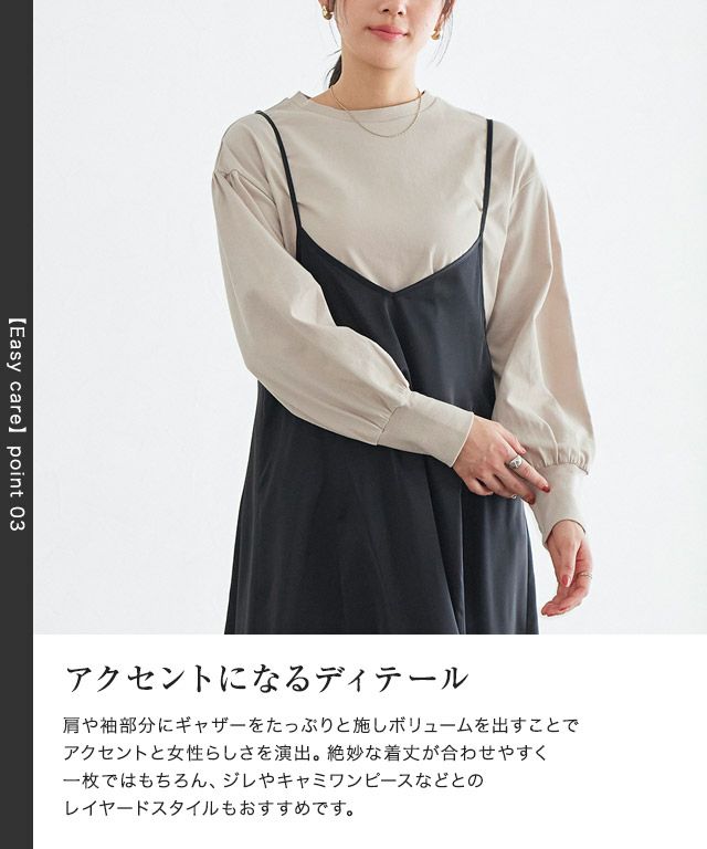 肩や袖部分にギャザーをたっぷりと施しボリュームを出すことでアクセントと女性らしさを演出。絶妙な着丈が合わせやすくボトムスを選ばず、一枚ではもちろんジレやキャミワンピースなどとのレイヤードスタイルもおすすめです。