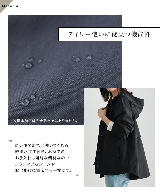 軽撥水加工を施した生地を使用したマウンテンパーカー。ソフトさのある肌触りでストレスフリーな着心地です。お仕事にも使えるカジュアル過ぎない一枚。