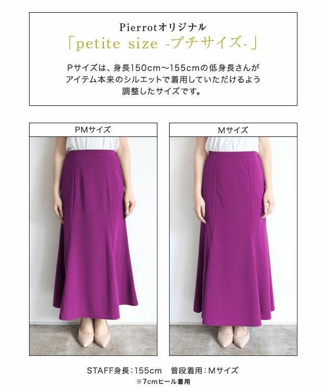 低身長の私(154cm)にはPMサイズが大変ありがたく、また標準体重より少し上のため、ウエストバックゴムで助かりました。薄手のニットをインできるくらい余裕があります! 低身長ですがロング丈が好きなので、足首あたりの長さで丁度いいです! シーズンレスで着れそうなので大事に着ます(*^^*)♪