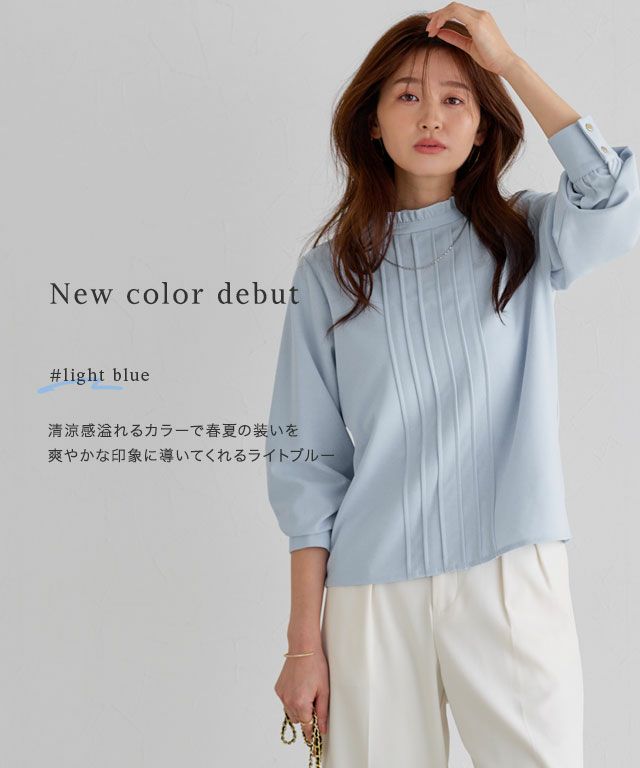 “カットソーなのにブラウス見え”を叶えるカットジョーゼット素材を使用。程良い落ち感がきちんとした印象をプラスします。伸縮性があり、裏面がさらっとした肌触りのブラウス。シワになりにくく、お手入れが簡単なのにキレイ見えするところも魅力の一つです。